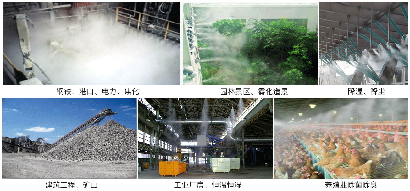 金属矿山、施工工程、砂石骨料、垃圾除臭、化工、钢铁冶炼、食品、园林景观等。改善作业环境,避免对身体带来不适感,提高生产水平和生产质量。